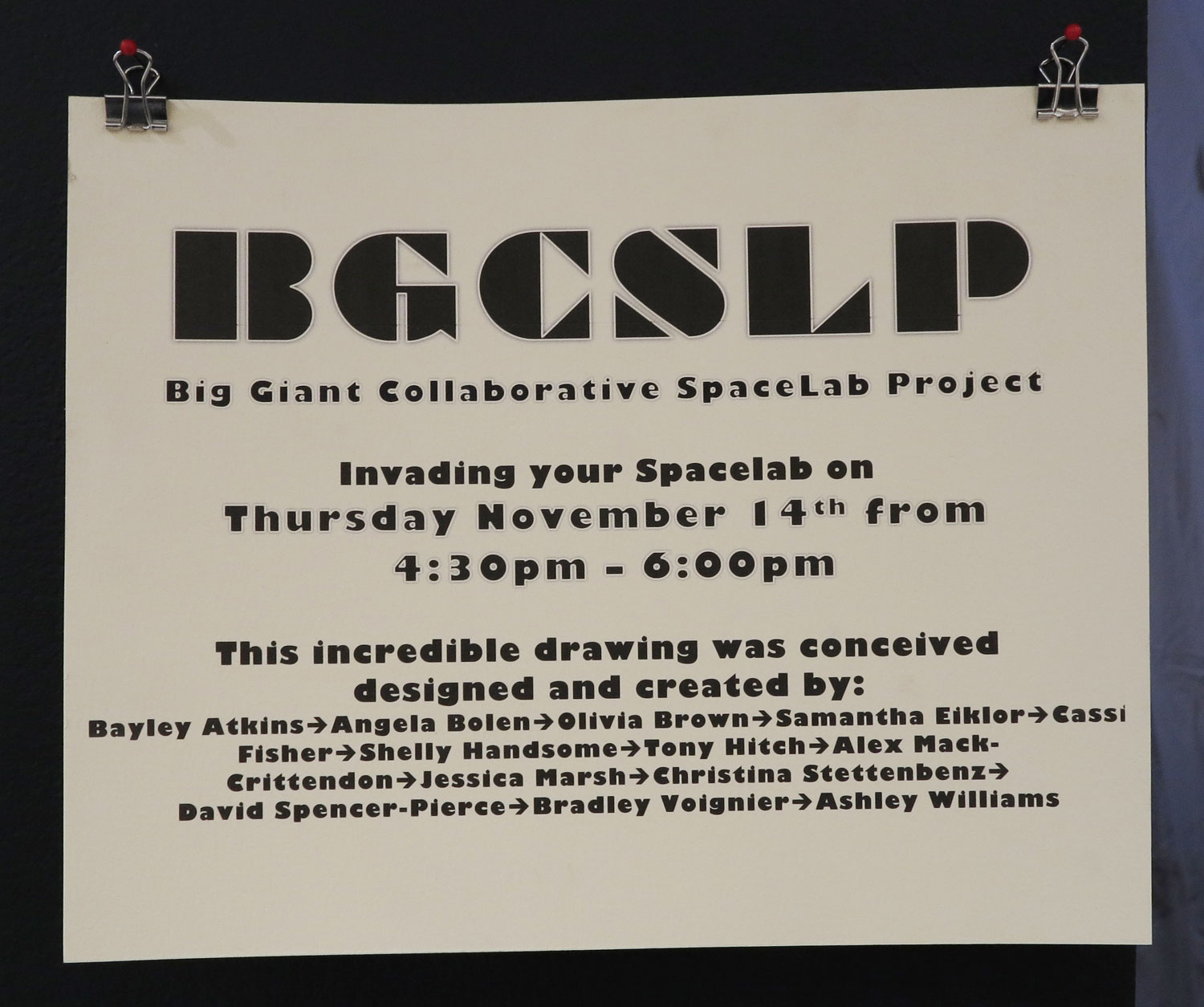 Big Giant Collaborative SpaceLab Project – 11.14.13 November 14, 2013November 7, 2014 | Prof. Brian Share this: Click to share on Facebook (Opens in new window) Facebook Click to share on X (Opens in new window) X Like Loading... Related